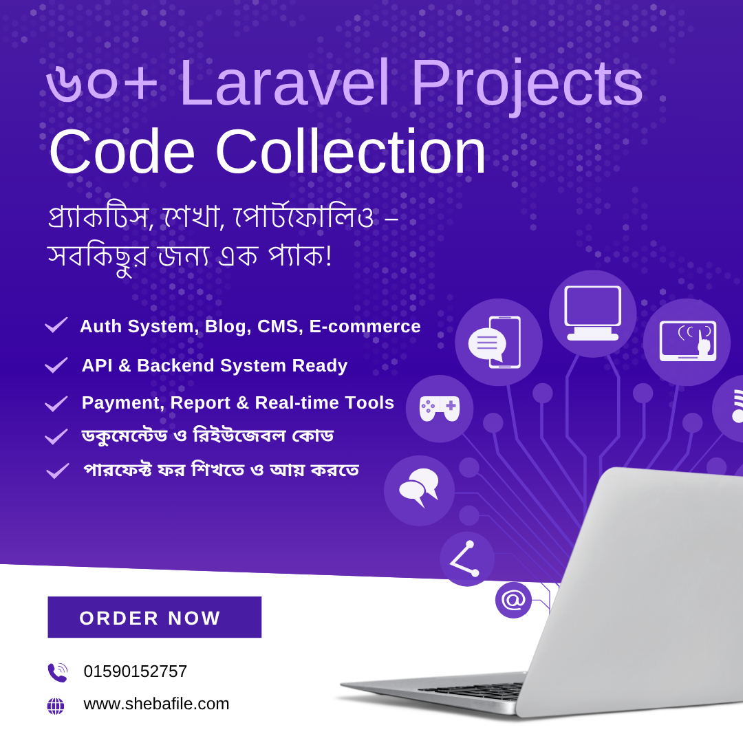 আপনার লারাভেল দক্ষতাকে নতুন উচ্চতায় নিয়ে যেতে এখনই সংগ্রহ করুন “55+ লারাভেল প্রজেক্ট কোড কালেকশন”।